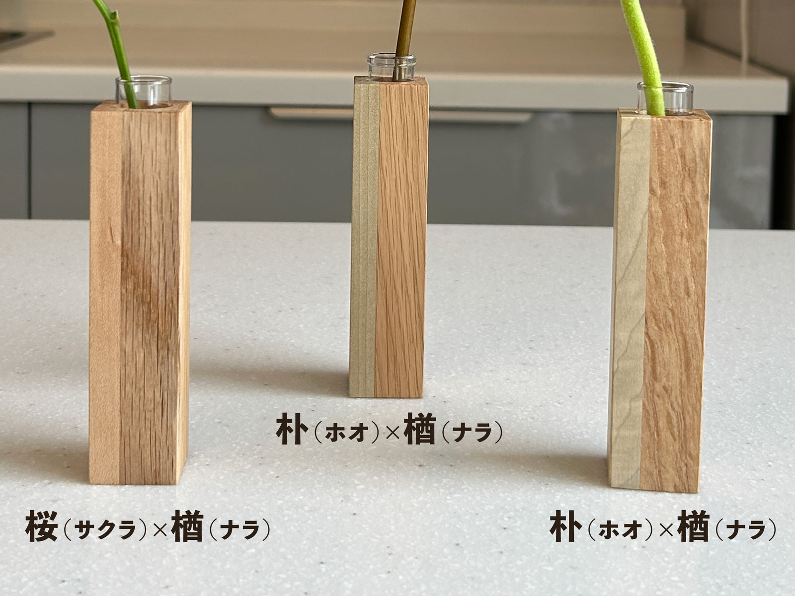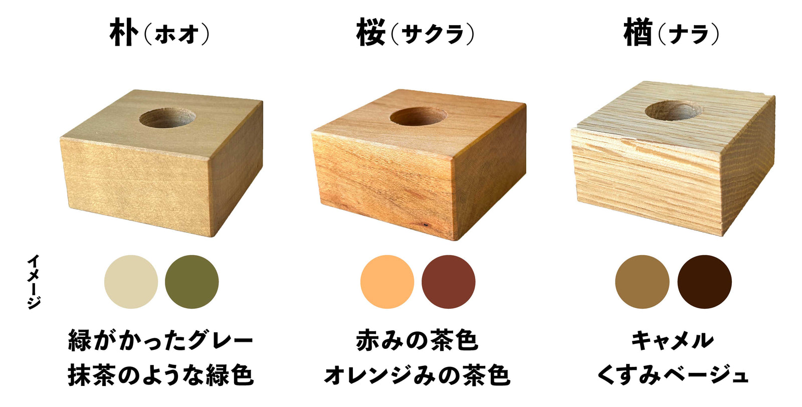 土台部分は、飛騨産広葉樹の「朴(ホオ)」「桜(サクラ)」「楢(ナラ)」の3つの樹種のうち、2種類をつなぎ合わせた「朴×楢」「桜×楢」の2パターンからお選びいただけます。
