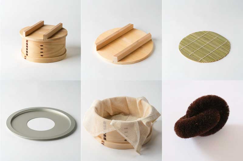 岐阜の曲物職人が丁寧に作った和せいろと、和せいろを初めて使う方におすすめな基本が揃ったスターターセット。フタと本体に加え、竹すだれ、蒸し板、蒸し布、お手入れ用のたわしをお届けします。